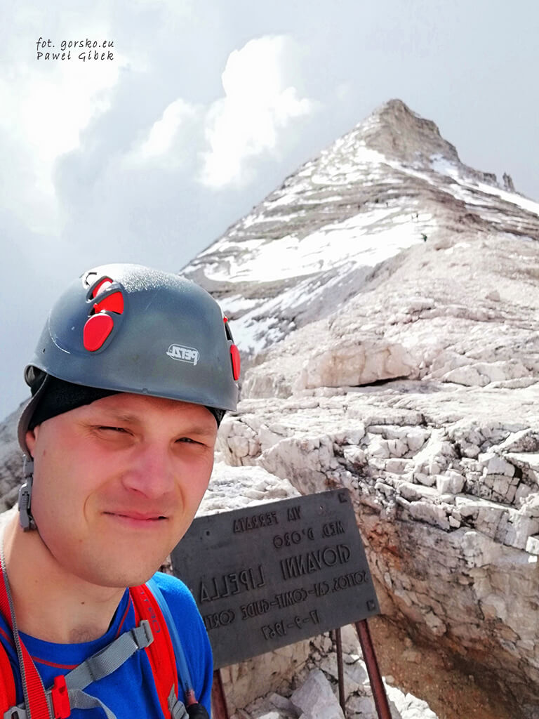 Dalej jest już łatwo. Idziemy jeszcze kawałek w górę i po chwili przed oczami ukazuje nam się pole przed-szczytowe Tofany di Rozes oraz tabliczka informująca o końcu via ferraty Giovani Lipella. To punkt w którym możemy zejść w dół i udać się do schroniska lub też pójść w górę na szczyt. Jeśli nie trafimy na załamanie pogody to wybór jest w zasadzie jasny. Idziemy w górę na wierzchołek. We wrześniu był on już częściowo zaśnieżony. Bardzo żałowałem, że nie miałem przy sobie chociaż raczków, bo miejscami było naprawdę ślisko. Do tego mnóstwo luźnych i zsuwających się kamieni. Nie był to najprzyjemniejszy fragment drogi, ale wieńczy go szczyt, więc zaciskając zęby parłem do przodu. W końcu po około 45 minutach od końca ferraty docieramy na wierzchołek Tofana di Rozes. Na szczycie znajduje się duży krzyż.