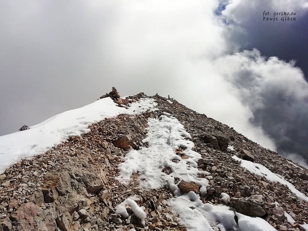 Podczas wrześniowego wyjścia przez prawie cały dzień towarzyszyła mi piękna pogoda. Będąc już jednak na szczycie niestety nie mogłem liczyć na widoki. Strona zachodnia była w miarę dobrze widoczna, ale ją już zdążyłem dokładnie obejrzeć, bo tą częścią ściany prowadziła ferrata. Bardziej interesował mnie widok na drugą stronę szczytu, ale niestety gęste chmury zasłoniły krajobraz. Pozostało więc zrobienie kilku zdjęć i rozpoczęcie żmudnego zejścia… najpierw po śniegu, a potem kruchych kamieniach.