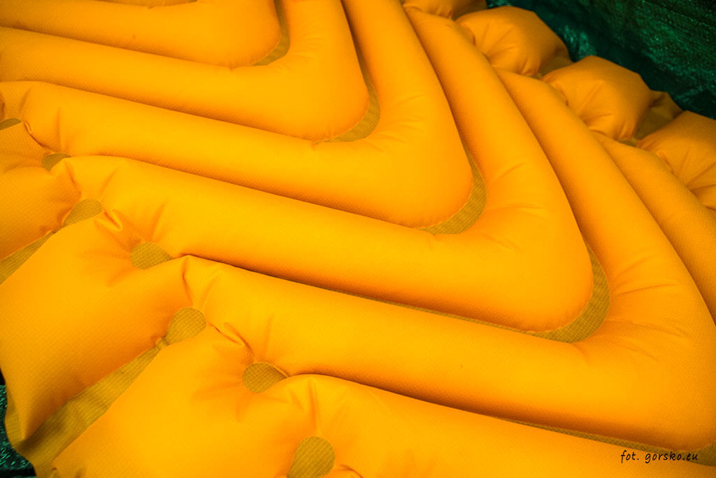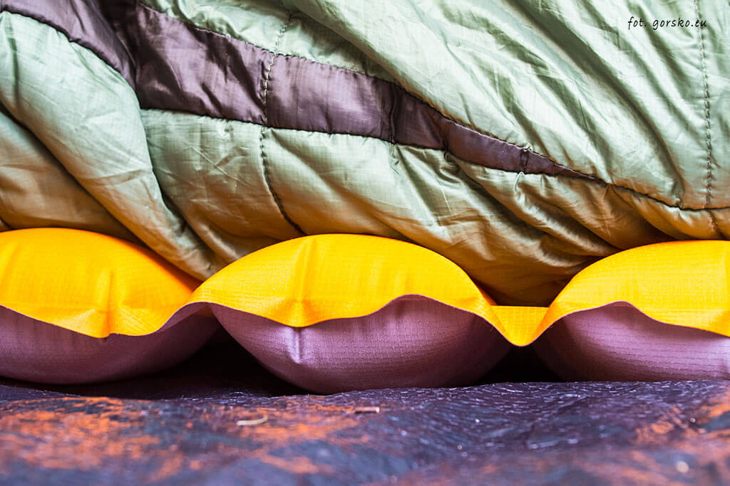 W zwykłych materacach, które z reguły mają jednolitą powierzchnię, śpiwór ulega znacznej kompresji pod ciężarem ciała. W efekcie traci sporą część ze swoich właściwości izolacyjnych. Inaczej jest w przypadku komór V, pomiędzy którymi znajduje się wolna przestrzeń. Jest ona wypełniana przez śpiwór, który w tych miejscach może się swobodnie rozprężać. Norma ASTM nie bierze tego pod uwagę, choć przecież pod namiotem zawsze śpimy w śpiworze.