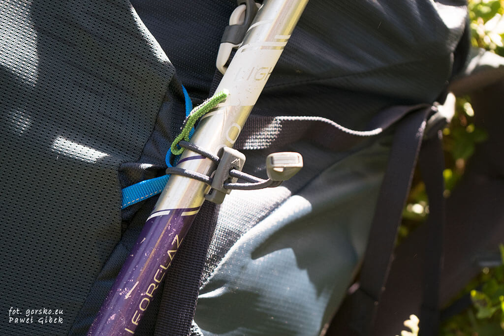 Kolejny mocny punkt plecaka Gregory Stout to możliwość troczenia sprzętu. Wyposażono go w 2 mniejsze pętle w które można włożyć dolną część kijów oraz 2 większe, które można wykorzystać do troczenia czekana. Mniej więcej na środku plecaka zlokalizowano 2 elastyczne troki, którymi chwycimy górą część kijów lub czekana. Te troki mogły by być trochę wyżej. Ich stosunkowo niskie umiejscowienie sprawia, że kije nie trzymają się zbyt stabilnie.