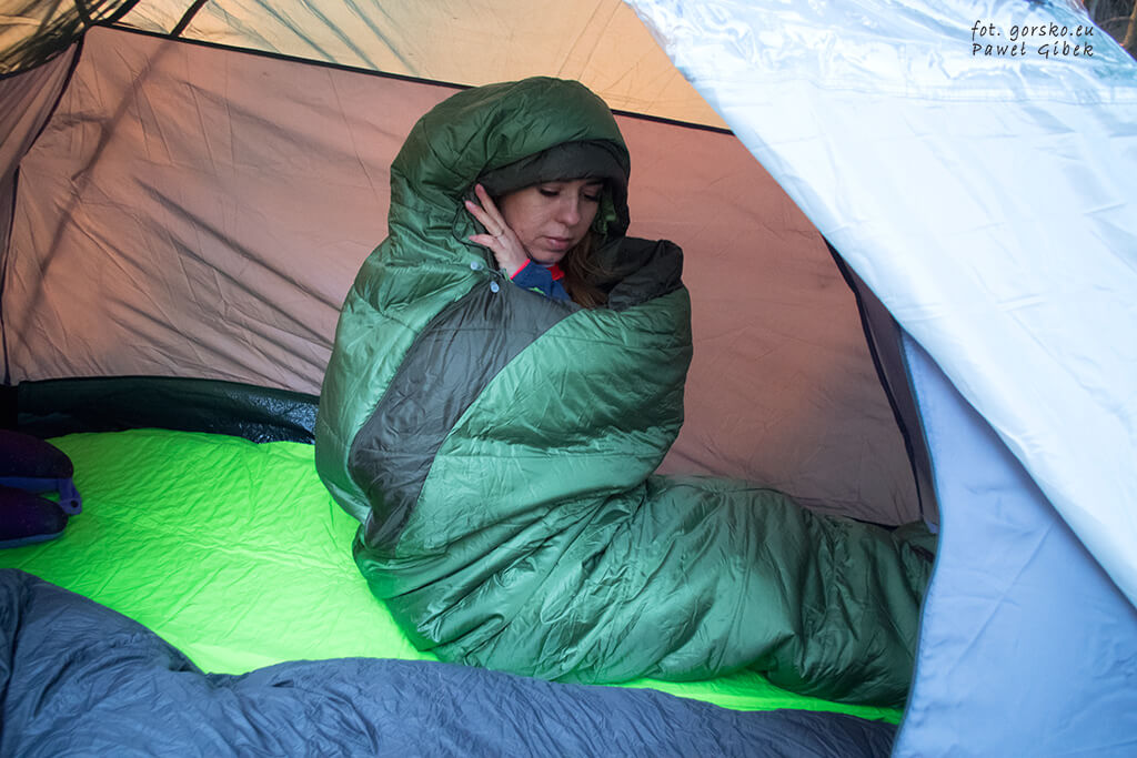Śpiwór Marmot Trestles Elite Eco 30 testowałam wczesną wiosną, również w niskich temperaturach wynoszących niewiele ponad 0 °C. Temperatura była więc nieznacznie niższa od tej zalecanej przez producenta dla kobiet. W takich warunkach najbardziej komfortowo spało mi się mając na sobie dwie warstwy tj. bieliznę termoaktywną, lekką bluzę biegową oraz dodatkową warstwę na nogach. Tę drugą warstwę można w razie czego zastąpić np. wkładką do śpiwora.