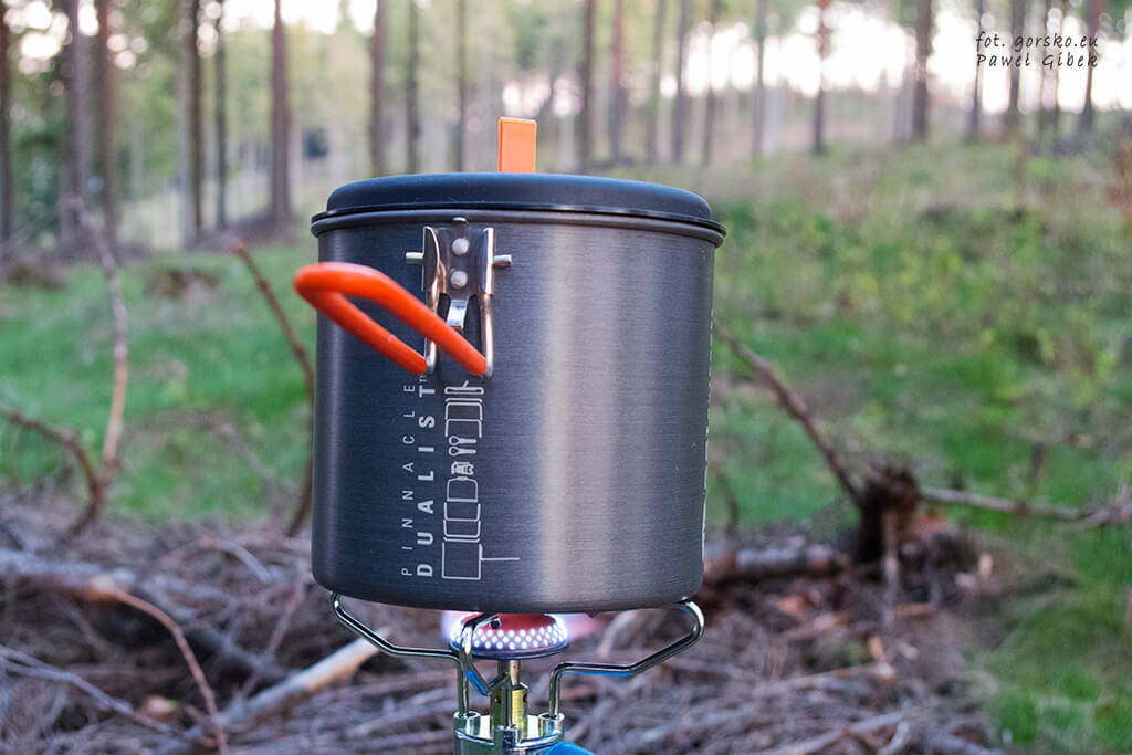 Najważniejszym elementem kompletu Pinnacle Dualist jest garnek wykonany ze wzmocnionego anodowanego aluminium. To materiał, który świetnie się sprawdza w garnkach turystycznych, bo jest wytrzymały i lżejszy od stali. Pojemność naczynia wynosi aż 1,8 litra. Wystarczy zatem tylko jedno gotowanie, aby uzyskać prawie 2 litry wrzątku. Taka ilość pozwoli przygotować np. 2 pełne termosy herbaty lub zalać 2 liofy i zrobić 2 kawy albo herbaty w znajdujących się w zestawie miskach. Znaczna pojemność garnka będzie także bardzo przydatna zimą podczas topienia śniegu albo w sytuacji, gdy będziemy chcieli zagotować wodę dla większej ilości osób np. dla nas i dla podróżujących z nami znajomych.